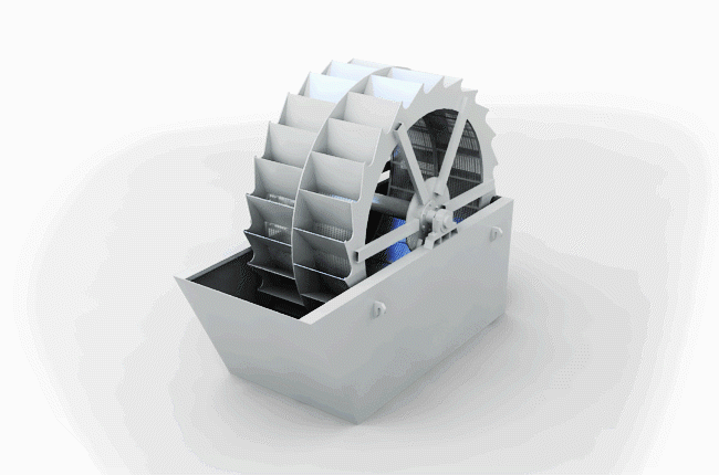 工作時,動力裝置通過三角帶、減速機、齒輪減速后帶動葉輪緩慢轉動,砂石由給料槽進入洗槽中,在葉輪的帶動下翻滾,并互相研磨,除去覆蓋砂石表面的雜質,同時破壞包覆砂粒的水汽層,以利于脫水;同時加水,形成強大水流,及時將雜質及比重小的異物帶走,并從溢出口洗槽排出,完成清洗過程。
