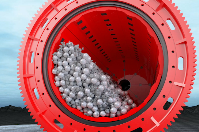 物料由進料裝置經入料中空軸螺旋均勻地進入磨機第一倉,該倉內有階梯襯板或波紋襯板,內裝不同規格鋼球,筒體轉動產生離心力將鋼球帶到一定高度后落下,對物料產生重擊和研磨作用;物料在第一倉達到粗磨后,經單層隔倉板進入第二倉,該倉內鑲有平襯板,內有鋼球,將物料進一步研磨;粉狀物通過卸料箅板排出,完成粉磨作業。
